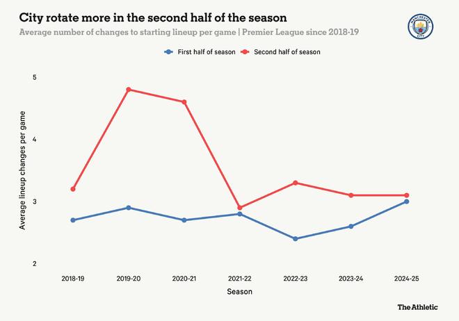 瓜迪奥拉比往常更多地坚持使用这套首选阵容,也许只是为了现阶段能跟上节奏,但在下半赛季,他肯定需要信任他更广泛的阵容。球员轮换及其带来的休息,一直是曼城在赛季后半段表现出色的关键支柱。